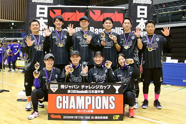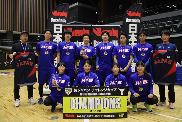 「侍ジャパン チャレンジカップ 第3回 Baseball5日本選手権」が1月17日(土)、18日(日)に横浜武道館(神奈川県横浜市)で開催され、オープンの部は「ジャンク5エレメンツA」が、ユースの部は「HANASAKI5」がそれぞれ優勝しました。準優勝、最優秀選手賞は下記のとおりです。